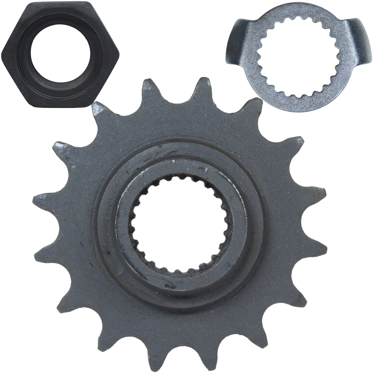 Kit composto por: 1 pinhão, 1 porca e 1 trava do pinhão