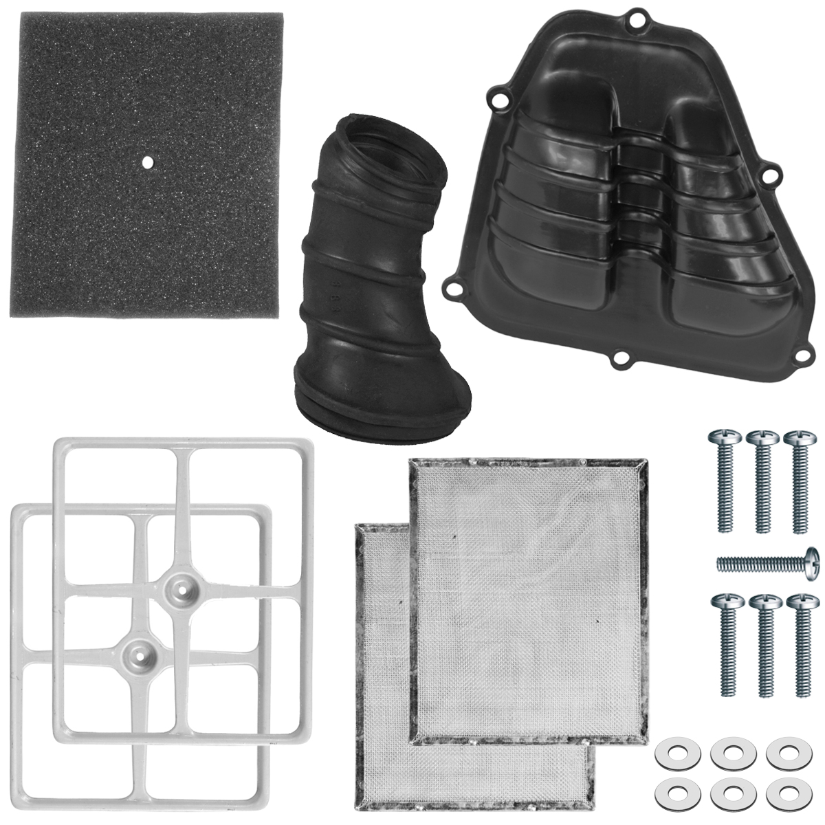 Kit composto por: 1 condutor, 2 grades ocas, 2 grades tela, 1 filtro, 1 tampa do filtro de ar, 7 parafusos e 6 arruelas